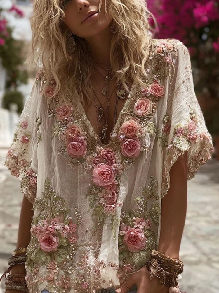 Vintage Pink Rose Embroidery Linen Short Sleeve T-shirt