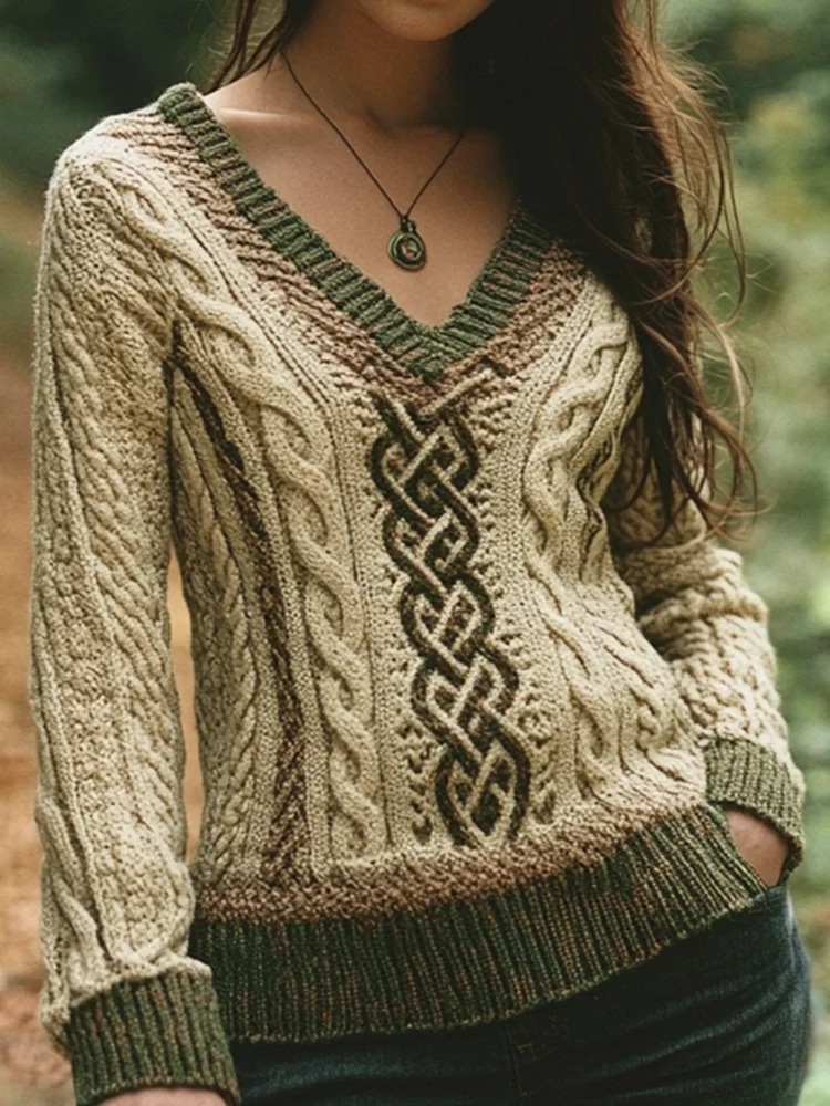 Vintage V-neck Knitted Two-tone Jacquard Irish Aran Sweater